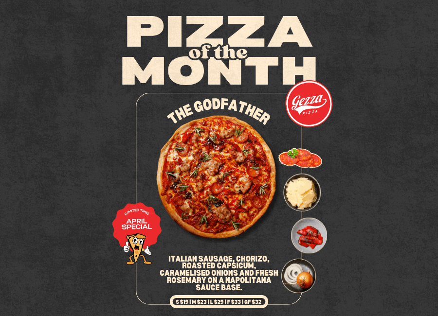 ITALIAN SAUSAGE, CHORIZO, ROASTED CAPSICUM, CARAMELISED ONIONS AND FRESH ROSEMARY ON A NAPOLITANA SAUCE BASE. April Special • Limited Time Only